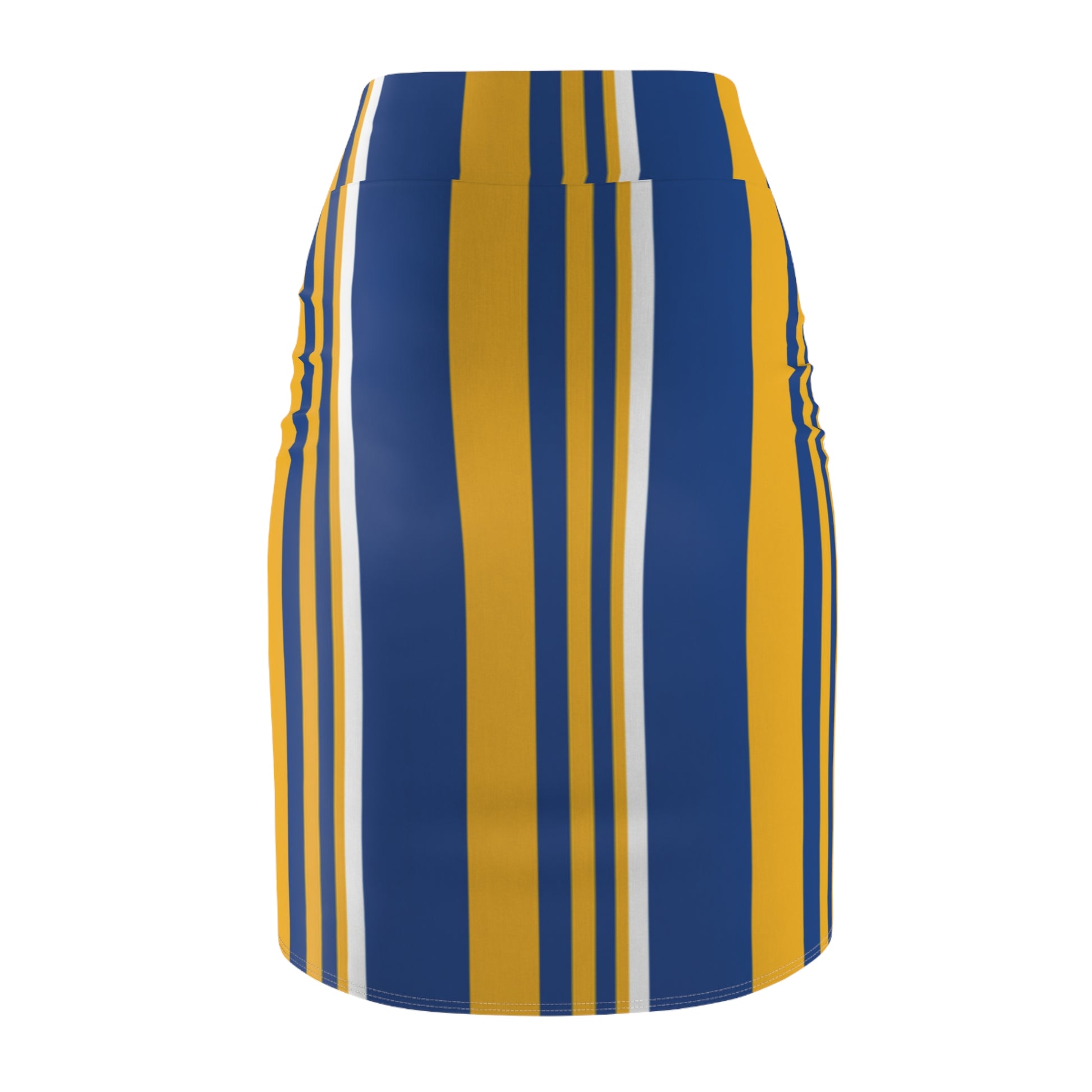This blue and gold striped pencil skirt is perfect for a sleek and stylish look. The 4-way stretch and mid waist fit provide comfort and flexibility for all-day wear. Ideal for women who love classic and versatile pieces, this skirt is a great addition to any wardrobe. Perfect for office wear, casual outings, and special occasions. Product features - 95% Polyester 5% Spandex for strength and flexibility - Flatlock stitching for a seamless look - Roll to roll all-over printing for vibrant colors - 4-way stretch for freedom of movement - Assembled in the USA from globally sourced parts Care instructions - Line dry - Hand wash