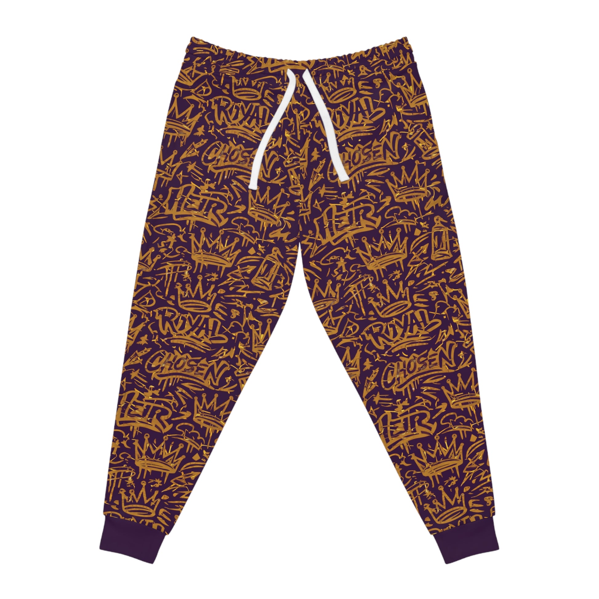 Slide into joggers that feel like your personal statement. These all-over-print joggers wear deep, graffiti-inspired lettering and crown motifs in warm golden tones over a rich plum background — bold but lived-in. The fabric is soft and slightly stretchy, so movement feels natural whether you’re pacing the city, heading to practice, or lounging with friends. Pockets keep your essentials close. The drawstring waist lets you tune the fit, while ribbed cuffs give a tapered, street-ready silhouette. Wear them with an oversized hoodie or layered under a long coat; they bring a confident, street edge and a sense of belonging to anyone who likes their clothing to speak louder than words.