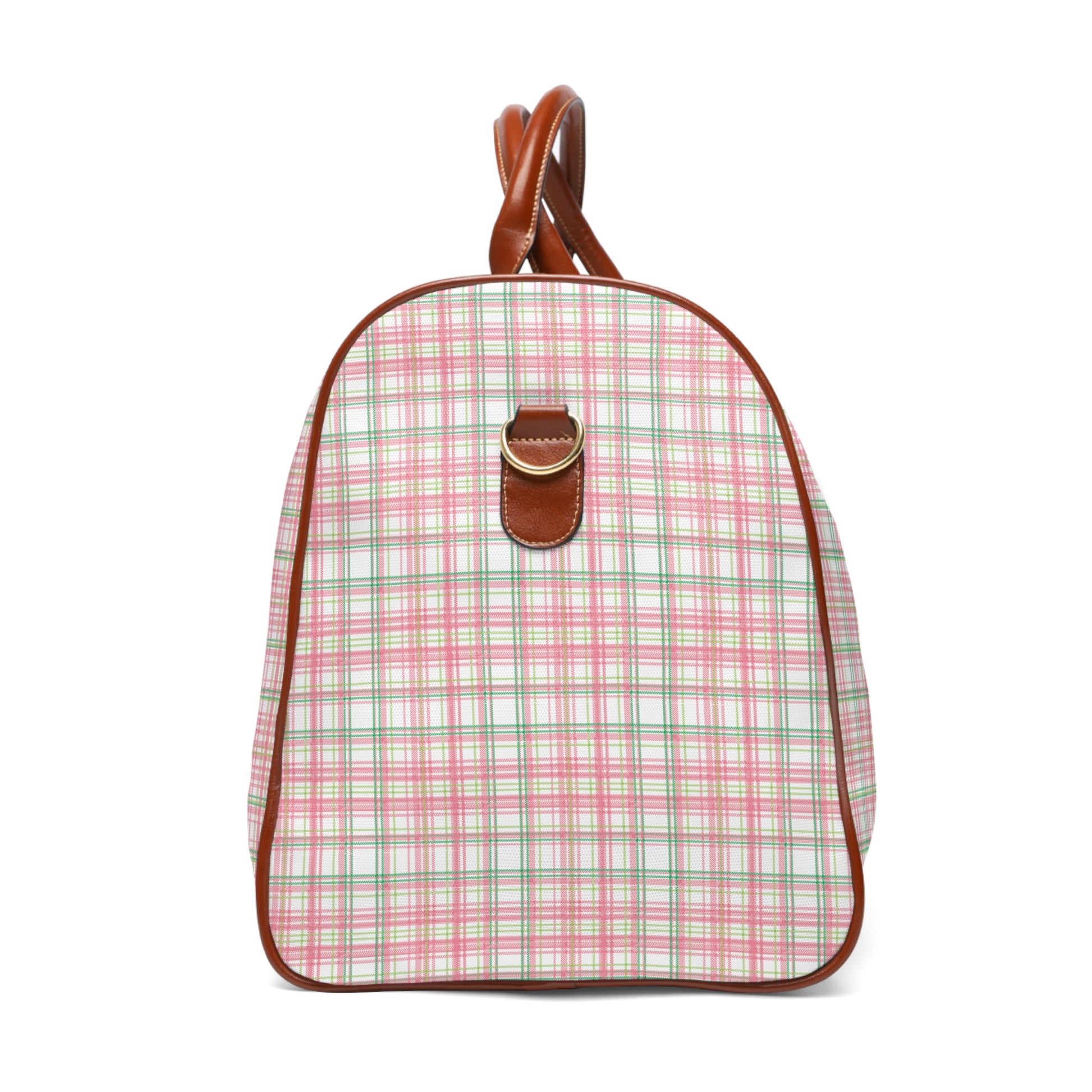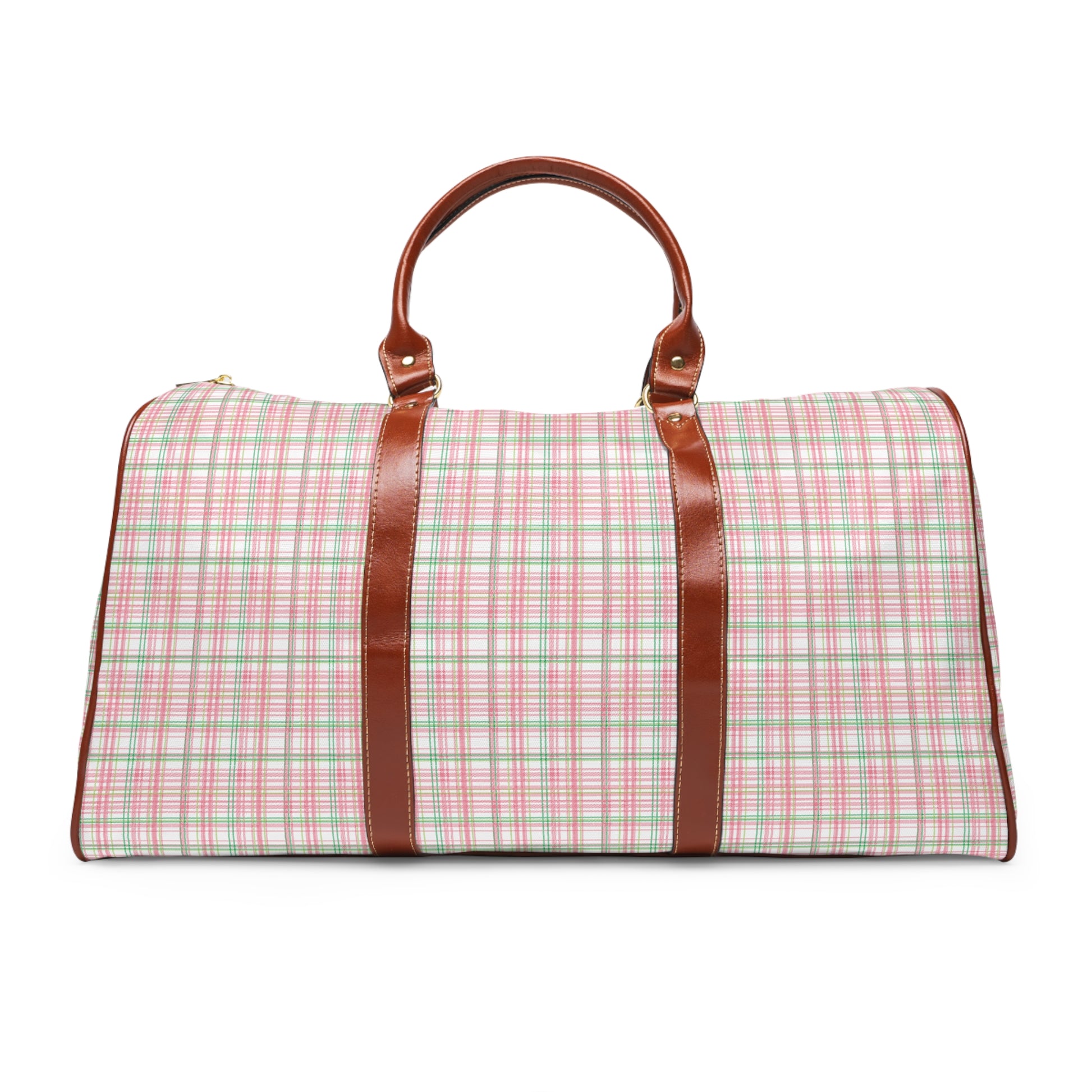 Stay stylish and organized on your travels with this waterproof travel bag featuring a salmon pink and apple green plaid design. Perfect for sorority members, this duffel bag is made from high-grade nylon material, has leather handles and bottom, and includes an extra open pocket inside. Ideal for sorority events, weekend getaways, and road trips.